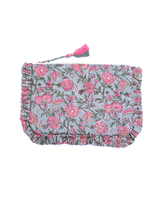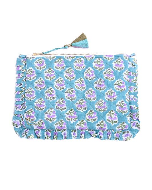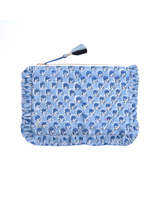 Block Print Ruffle Pouch - Floral On Sky Blue