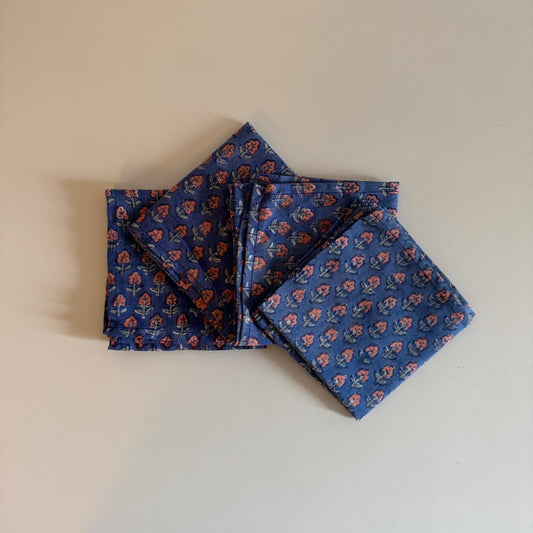 Block Print Napkin Set of 4 - Blue with Pink flowers