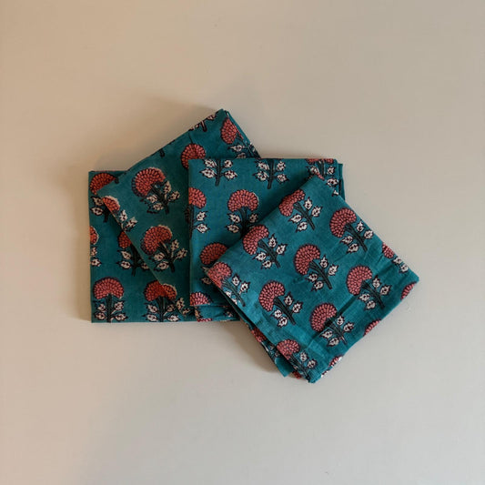 Block Print Napkin Set of 4 - Turquioise with Pink flowers