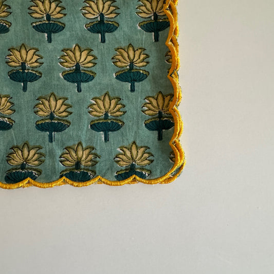 Scalloped Block Print Individual Napkin / Handkerchief - Turquoise with Yellow flowers