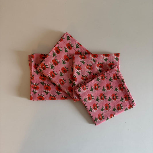 Block Print Napkin Set of 4 - Pink with Red flowers