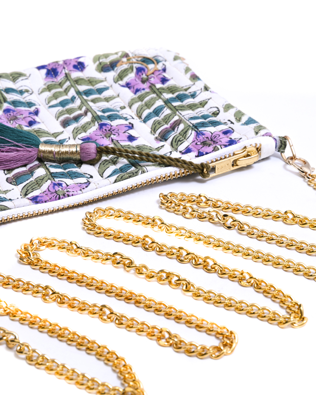 Inject a pop of colour into your outfit with our block printed clutches, complete with a metal gold chain. Perfect for carrying your essentials, with a small compartment inside. we love the tassel and gold detailing.