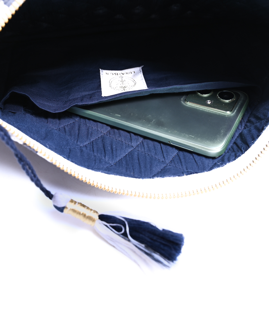 A great treat for yourself or a thoughtful add-on gift. The outer layer is made up of quilted, block printed cotton and the inner layer is a striped cotton fabric.
